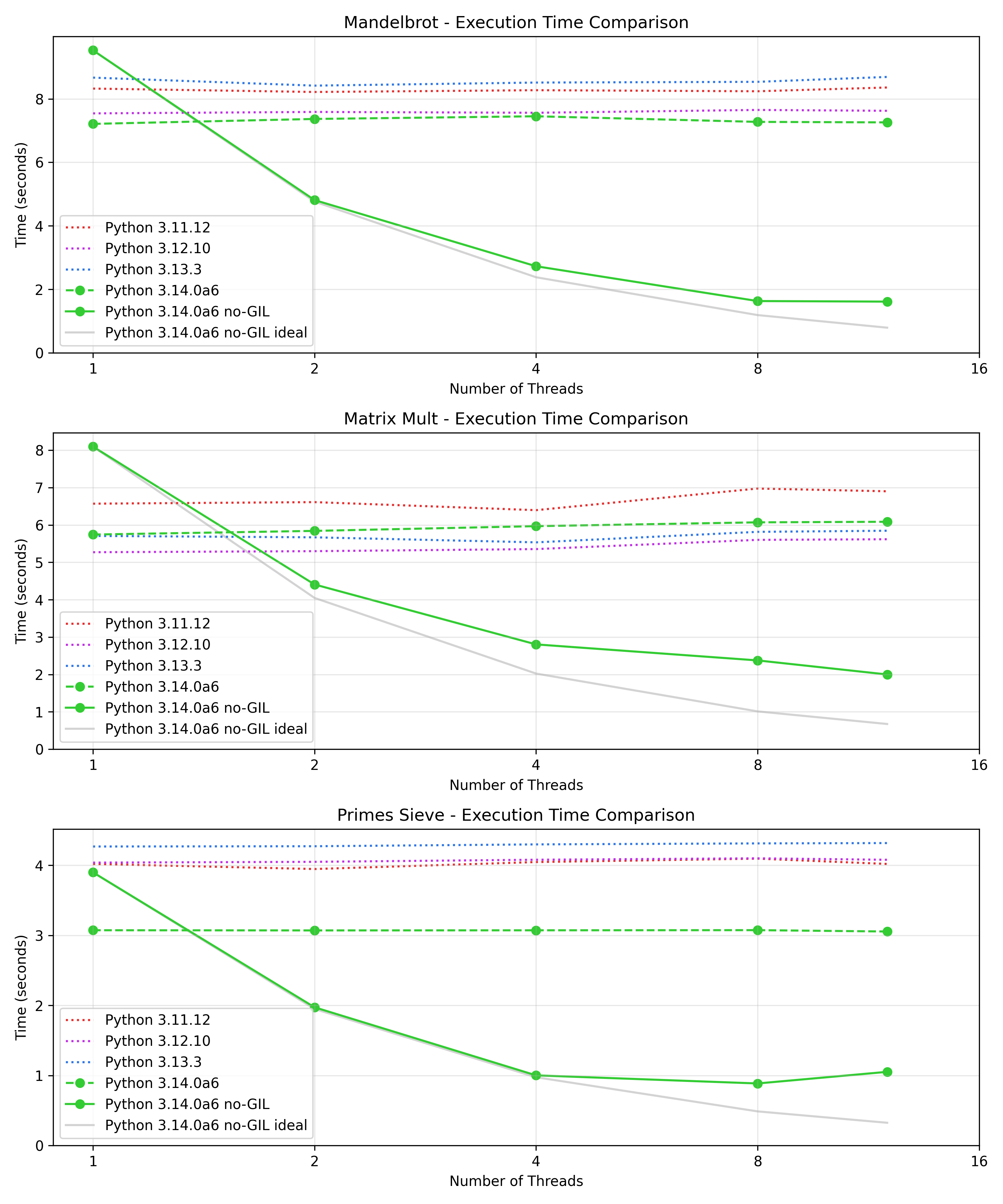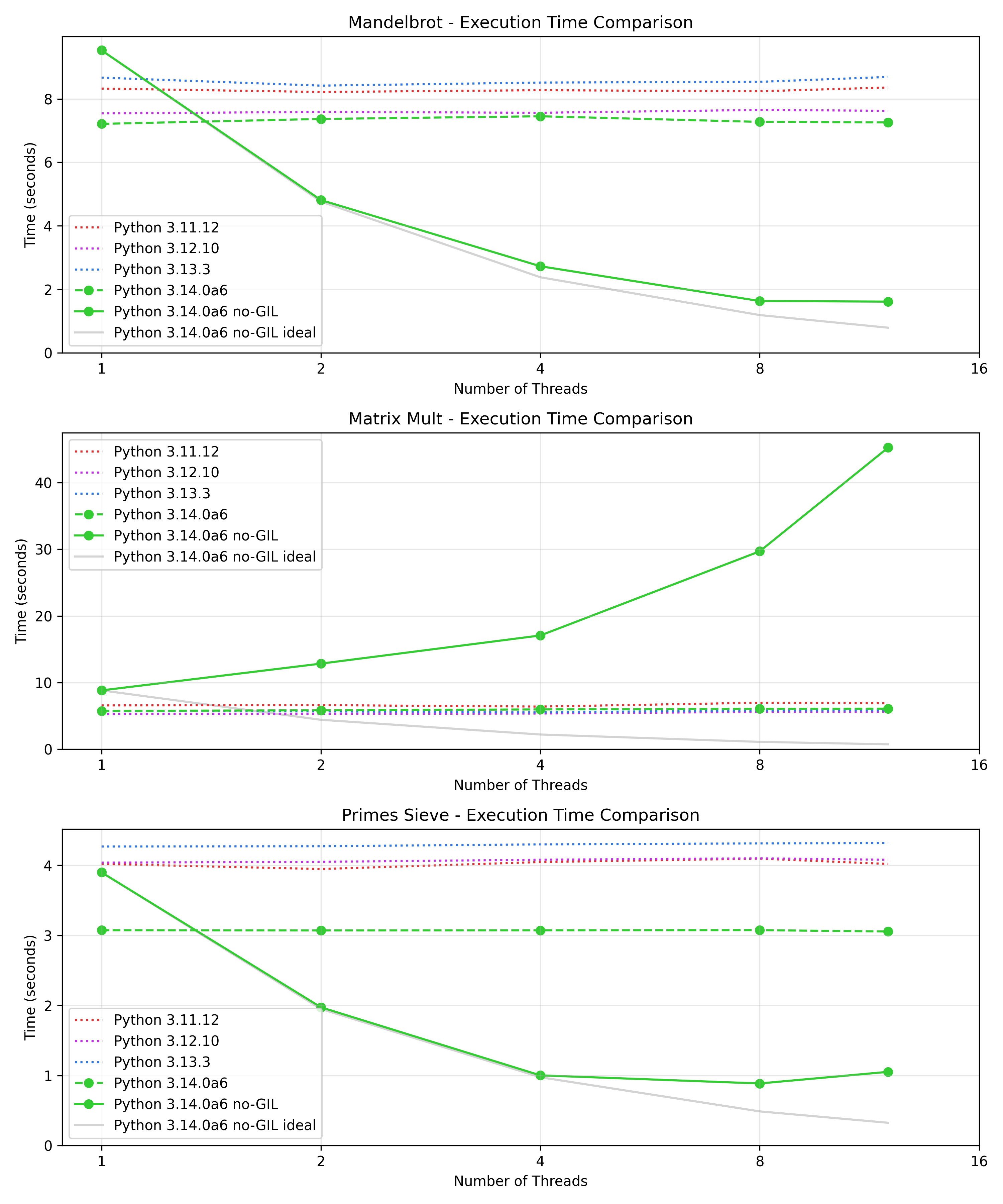 My first intuition when I see worse performance with increased number of threads is always lock contention. Indeed both the mandelbrot and the prime number sieve benchmark require basically no interaction between the threads, whereas in the matrix multiplication benchmark all threads read from the same matrices and write their results to the same matrix. In principle this should be fine: all access here is read-only, so there should be no need for locking. However, Python doesn't know this - another thread could be concurrently modifying the list, so it needs to acquire a lock for each access.